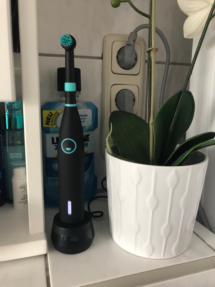 Der Flexkopf verhindert zu starkes aufdrücken, ganz toll finde ich die Zeitanzeige an der Ladestation. Diese zeigt bei Nichtbenutzung die Uhrzeit, wenn geputzt wird wird ein Countdown angezeigt wie lange man noch putzen muss.